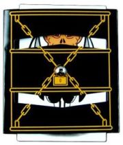 A vampire card is inserted into a case (representing a coffin) and secured with a fastener. The vampire card is unquestionably locked in place.