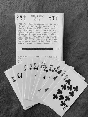 Half and Half is a business card effect, using a packet of specially printed business cards that have card faces on them -- some are five of diamonds and some are ten of clubs. The magi shows one of each and then folds them in half, so that he is able to place them side by side in what looks like a "half and half" card -- one half is the 5D and one half is the 10C. But the audience knows this is just the way it looks when two folded cards are put end to end. However, when the magi separates the two folded cards and unfolds them, they really have become half and half cards. The two mismatched H&H cards are given to the spectators as souvenirs.